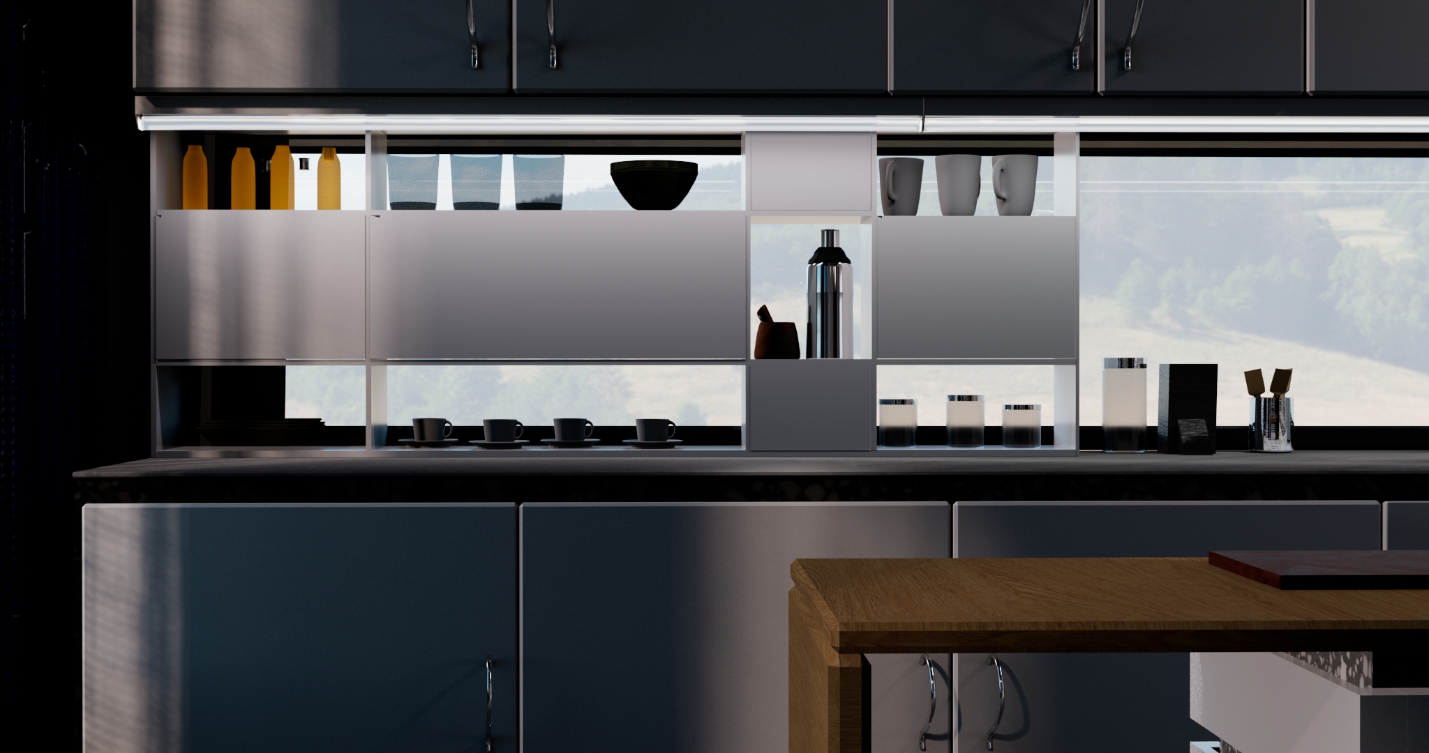 Working in Maya, we had to fully model and render a studio kitchen or apartment. Here is a picture of my kitchen.